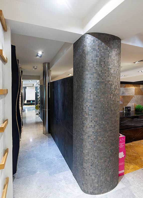 HSK Mosaics & Accessories are created by precision-cutting natural stone veneers into smaller elements and assembling them on a reinforced fiberglass mesh. This process allows for intricate patterns while preserving the authentic texture and character of real stone.
